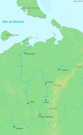 Pechora River Basin. The Pechora flows north into the Barents Sea. Its watershed extends east to the Ural Mountains (bottom right)