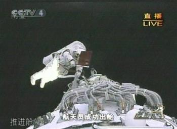 Chinese astronaut Zhai Zhigang opened the hatch of his Shenzhou 7 and took a brief stroll in orbit Saturday. This makes China only the third country in the world, after the United States and Russia, to have completed a space walk. More to the point, it demonstrates that China is ramping up for some of the heavy lifting required of long-term space projects (e.g. space stations and moon missions) which would require people moving outside of spacecraft for construction and repair projects.