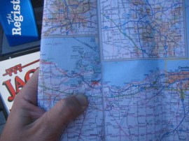 Yesterday, at the end of a particularly long leg, we found ourselves on Rte 80 in northern Ohio, looking for a meal that would please all and could be had fast. In other words, pizza. But where to look in the rolling cornfields of Ohio? We got off 80 and asked the toll booth attendant. She couldn’t think of any place that made pizza. What planet had we landed on? Michele and I consulted our road atlas, a misshapen, parchment-colored thing, to see if we could glean a site out of the black and red lines and place names.