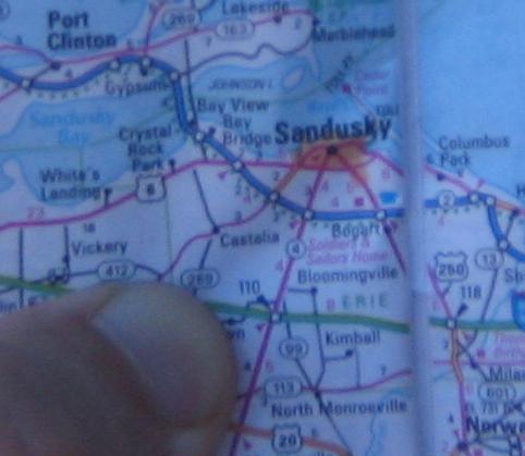 After some debate, we decided upon the town of Sandusky, about eight miles off of the highway from the exit. While it might have been possible to find pizza closer, it seemed unlikely to us that these small, silo-dotted towns would produce a pie to satisfy our elitist, bourgie palate. Without knowing anything else about the town of Sandusky, I liked the name, it sounded old, Polish perhaps? If so, I would imagine that it was settled in the early- or mid-19th century. Old Midwestern towns, I knew, were often built small and compact to accommodate walking traffic. These towns, with main street and thick brick commercial buildings, are now favorites of urban renovation, of ice cream shops, restaurants, and gourmet pizza. Sandusky, is this you? Moreover, the town was right on Lake Erie, at a point very close to the Canadian coast due north of the city. I saw them in my mind: hungry Canadian tourists climbing off the boat to celebrate summer at their favorite waterfront pizzeria.