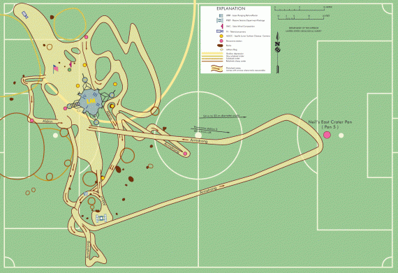 NASA map of astronaut routes over the Moon, superimposed over soccer field