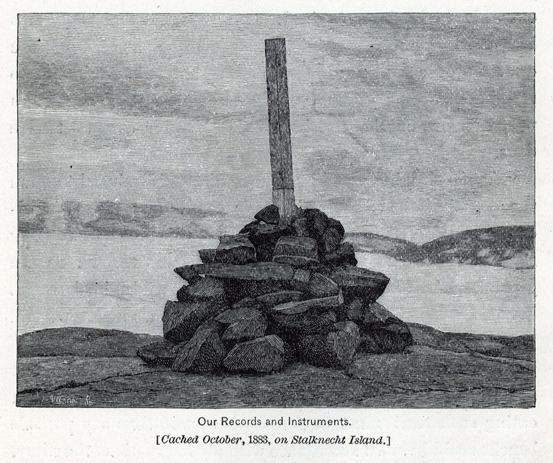The men continued to carry the pendulum, stripping off the tin shroud to reduce weight. Eventually, they cached the Peirce No. 1 on Stalknecht Island, just off the shore of Cape Sabine. While it had functioned as a precision instrument in Washington and Fort Conger, the Peirce No. 1 now became a rescue beacon for relief ships entering Smith Sound, its long box anchored as a tower to the rock cairn to make it more visible, a note tucked within the rocks giving the party’s location on Cape Sabine.